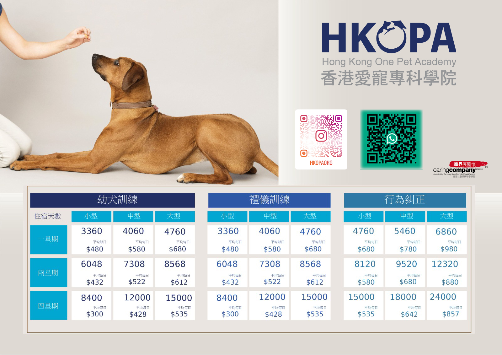 簡單的狗訓練班, 訓練通常四至五堂, 大約20小時便會完成了, 所以這些狗隻訓練收費價錢都會較便宜.